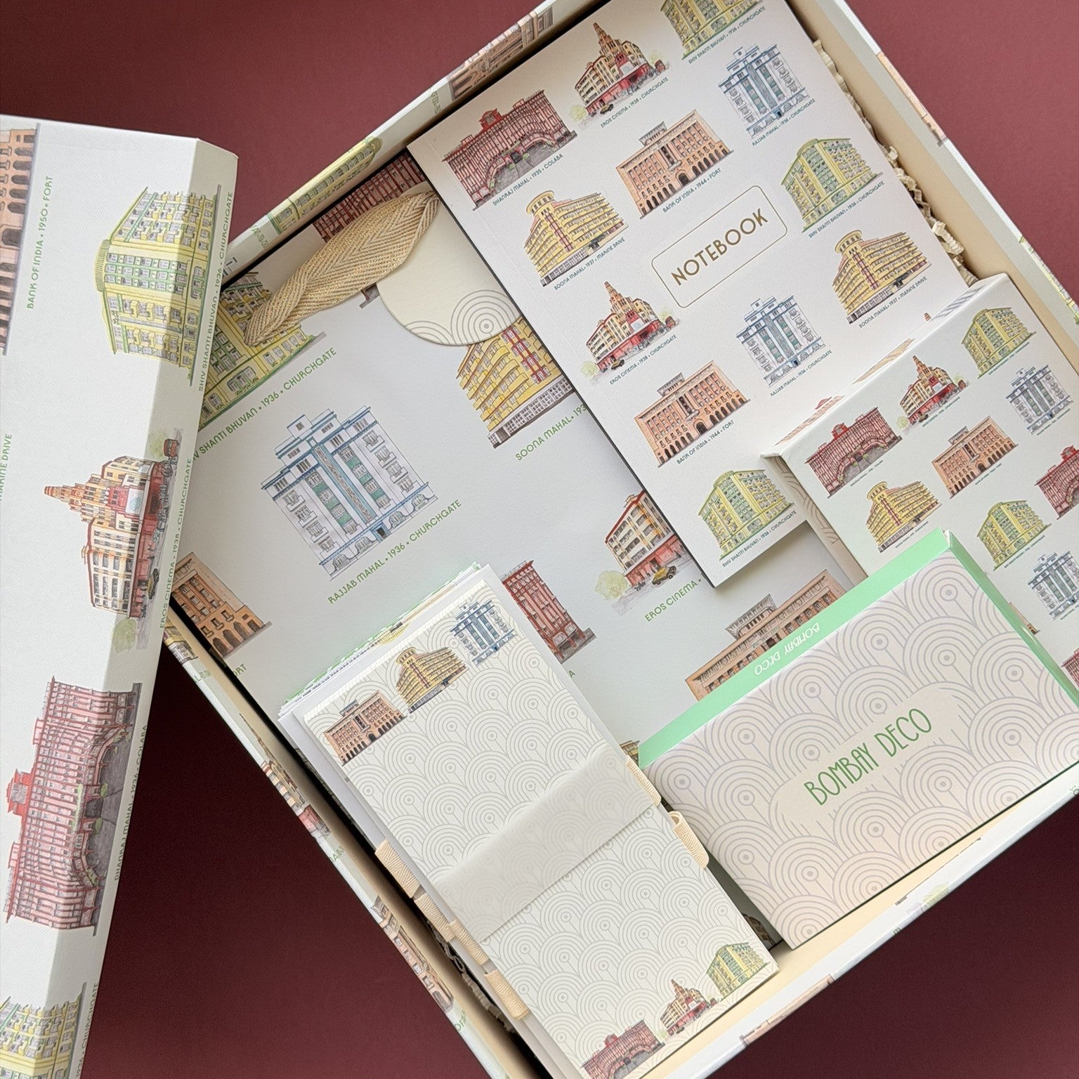 Born from the bold modernism of the 1925 Paris Exhibition, Art Deco found a vibrant new expression in Mumbai. Shaped by tropical light, local culture and ocean-inspired forms, it became uniquely Bombay. This stationery collection by Art Deco Mumbai Trust and Paperfields captures that spirit through delicate watercolours of the city’s iconic Deco buildings - a keepsake of design, heritage and home.