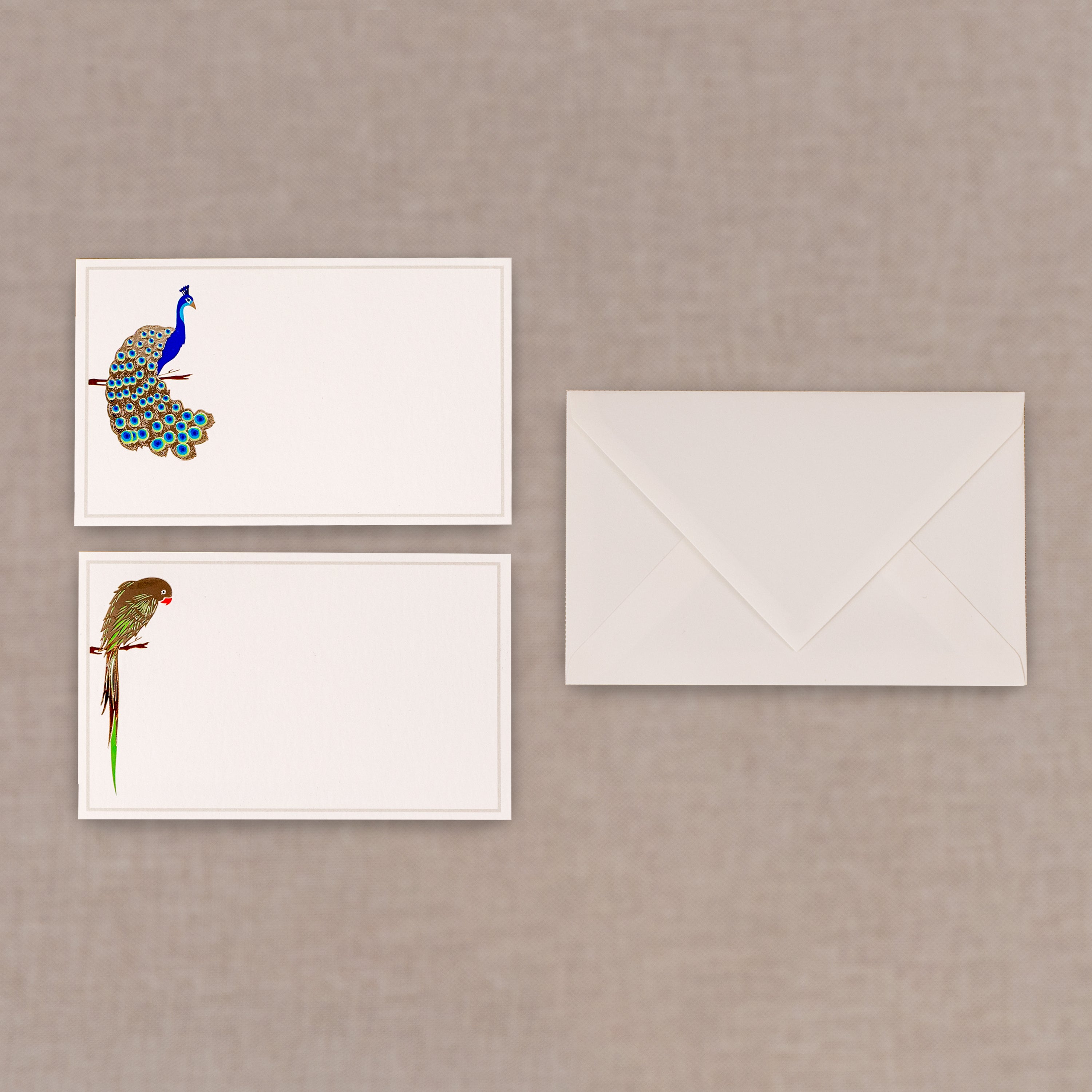 MorPopat - Hindi for 'peacock and parrot'. Elegant and beautifully detailed Indian birds are perched on the side of the notecards. They symbolise vision, patience, kindness, luck and freedom. The Indian tradition places birds in an exhausted position. Gold blue peacocks and elegant green parrots form motifs of this vibrant culture.