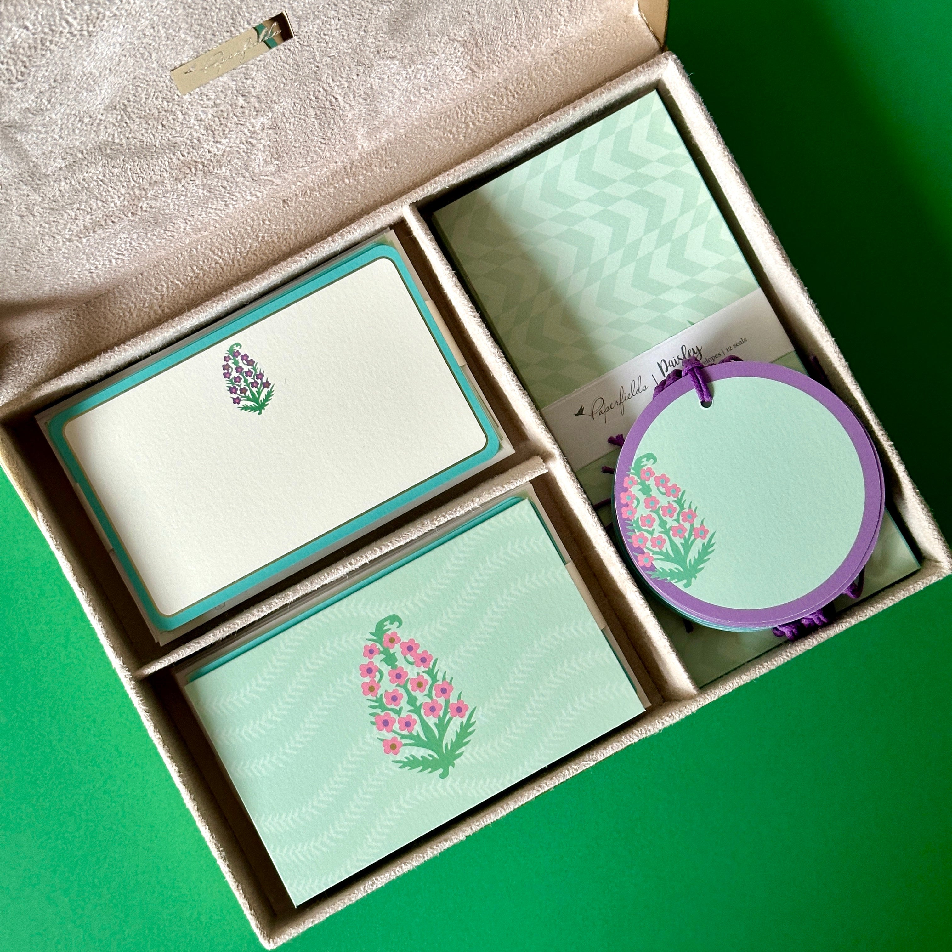 Box of 24 cards (12 flat and 12 folded) with coordinated envelopes, 12 money envelopes, 12 gift tags and 36 seals