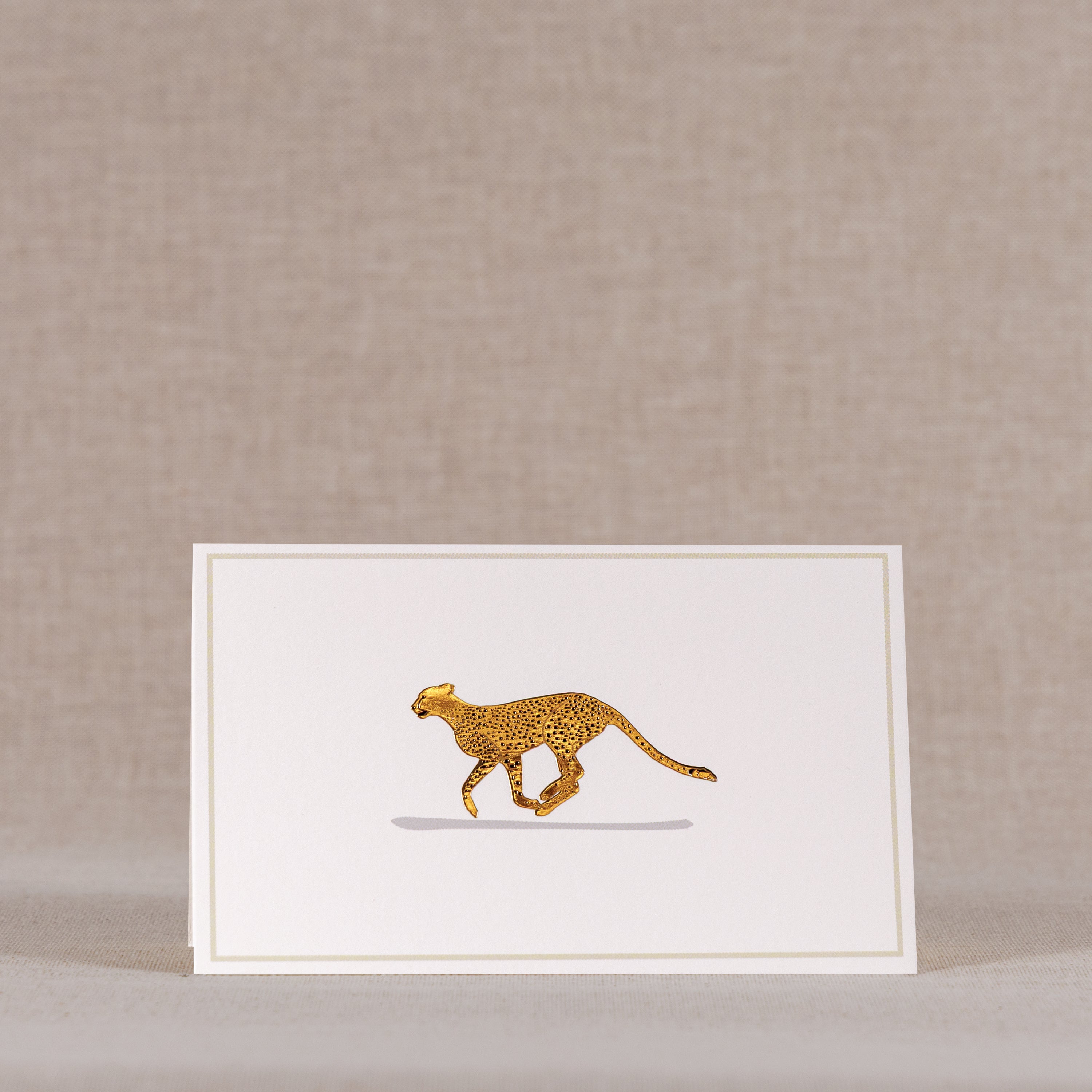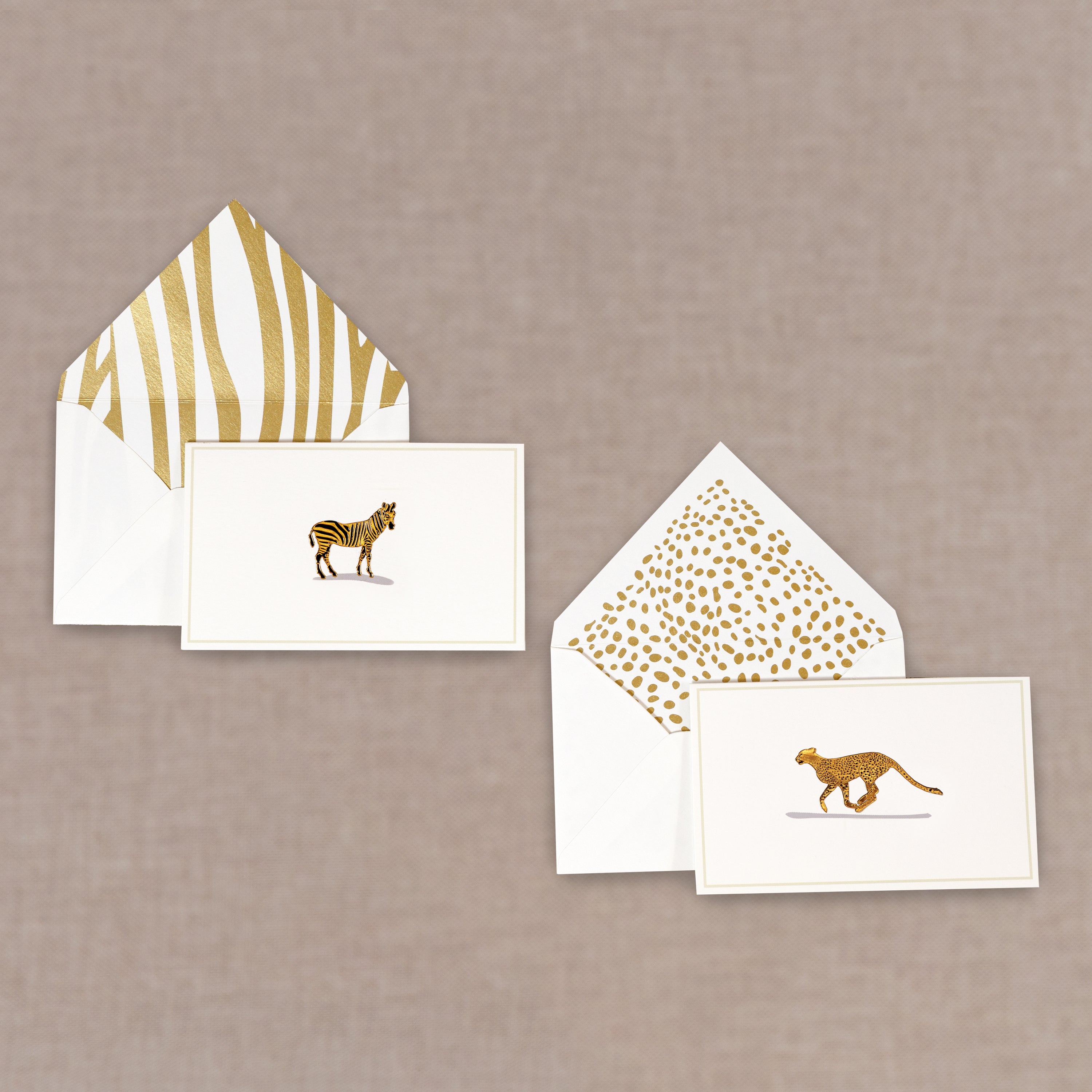 Applauding our love for the African savanna, this collection depicts the beauty of the cheetah and the zebra. It brings to you a stationery set of cards and envelopes where intricately handcrafted cheetahs and zebras create a landscape in gold.